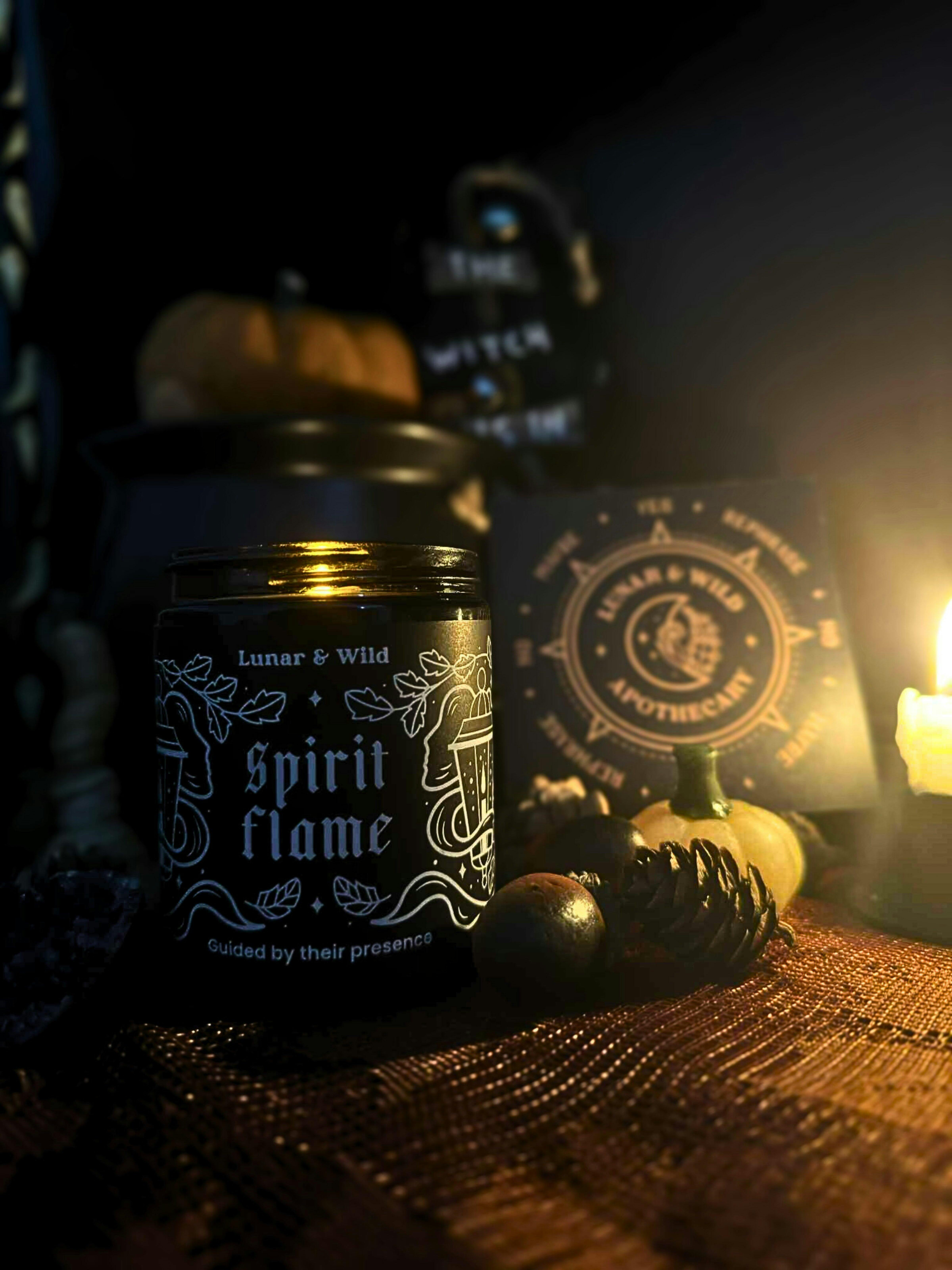 Step into the mystery of connection with Spirit Flame - a black wax candle crafted to honour the unseen and guide you through the thresholds between worlds. Scented with lavender, vetiver and mint essential oils, her fragrance is cool and clarifying, weaving calm presence with deep earth and a spark of freshness.